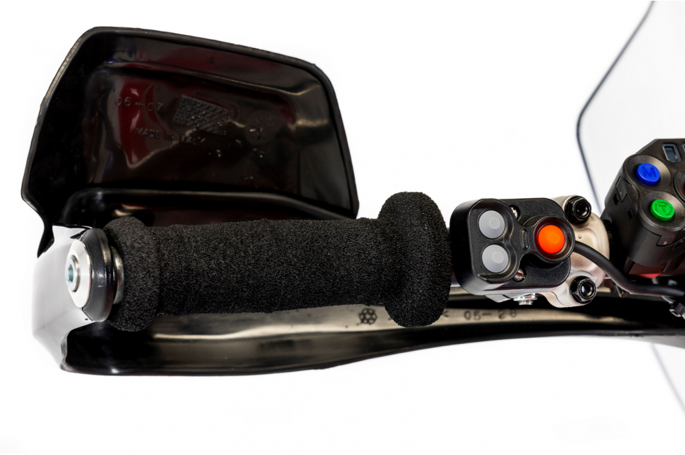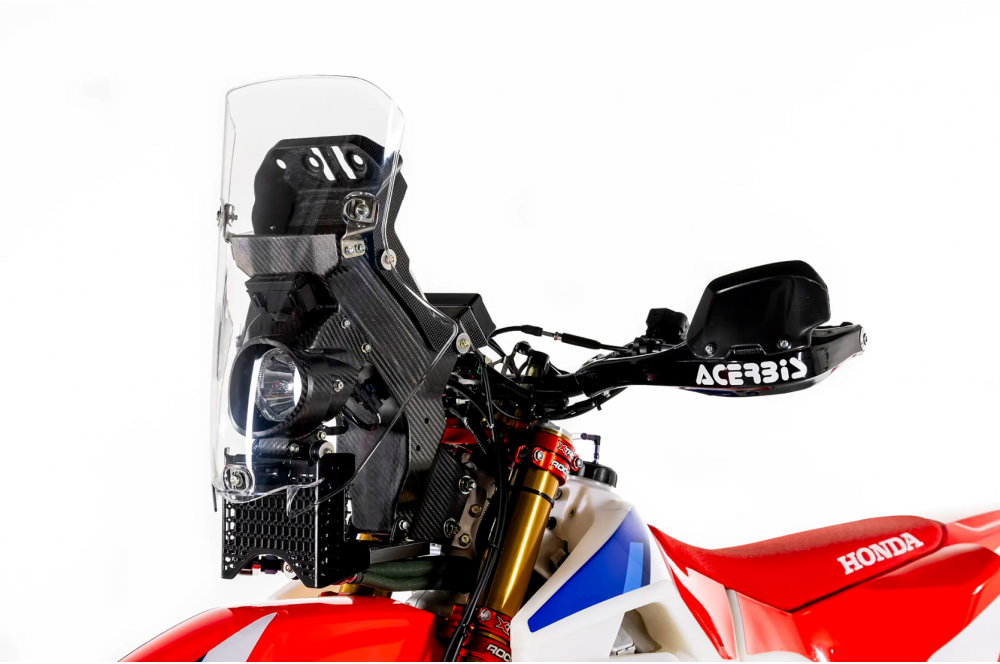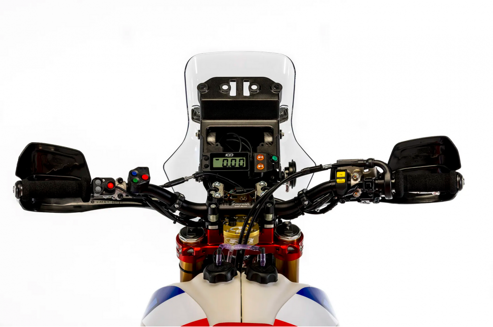 La moto est équipée d'un guidon Renthal, de protège-mains Acerbis, d'un garde-boue avant identique à celui de la CRF Rally d'usine, de repose-pieds surdimensionnés et d'un système d'éclairage full LED.