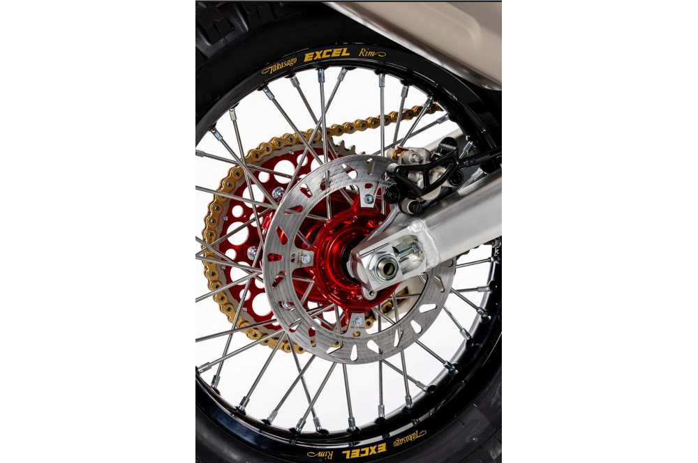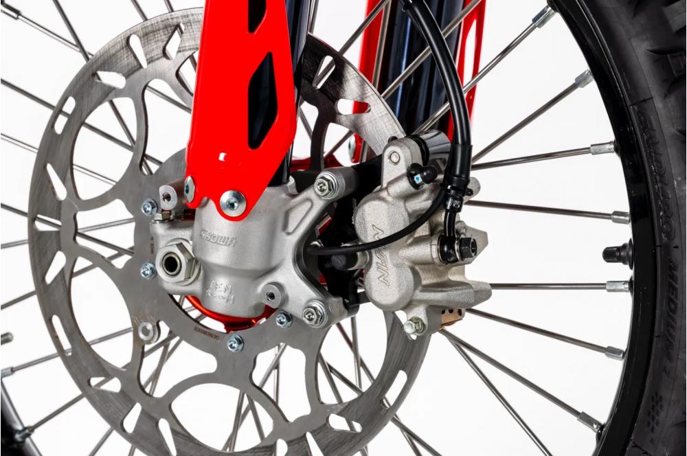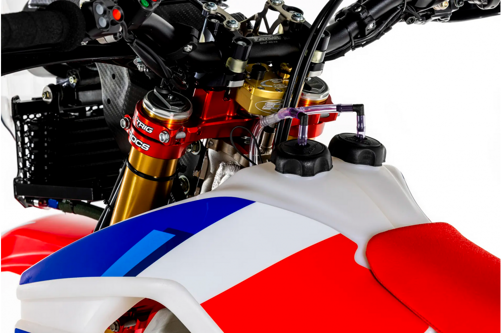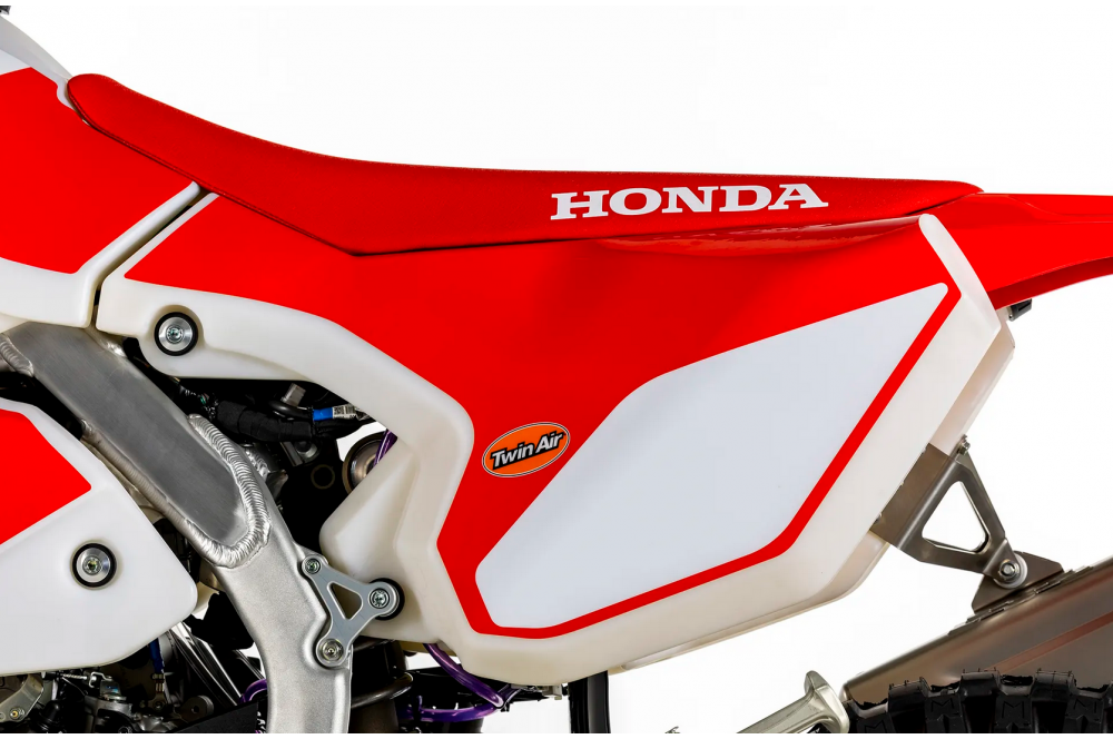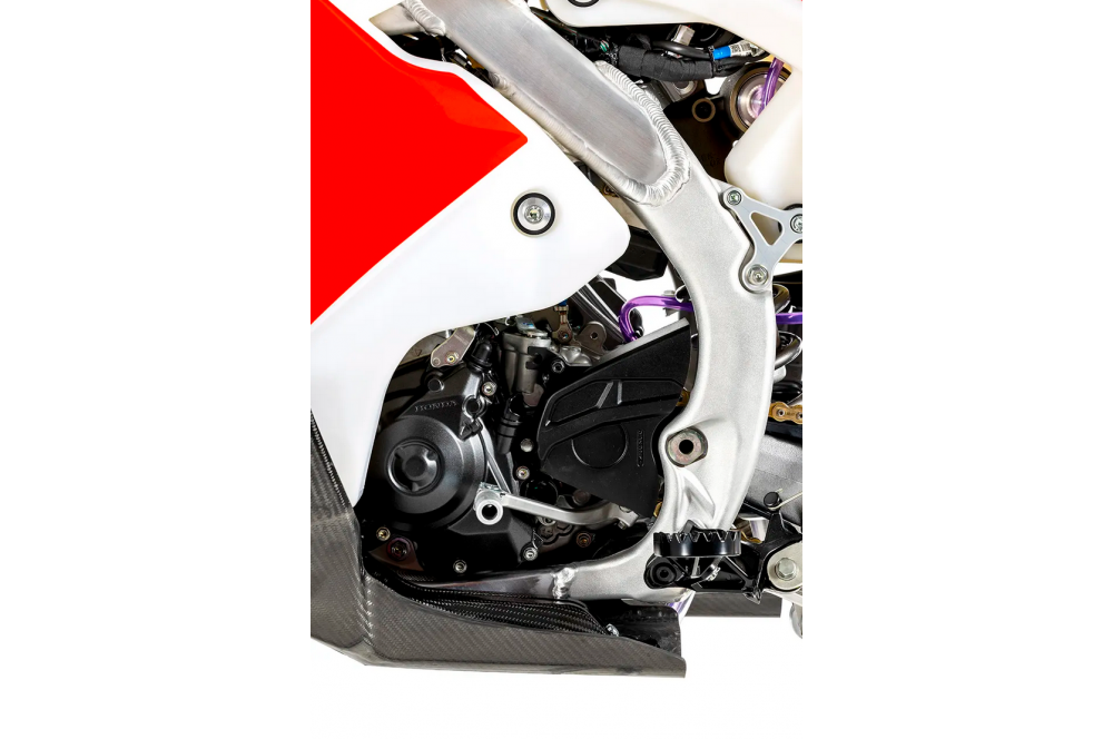 Comme sur la CRF450R Works Edition, la combinaison rigidité/résistance a été optimisée grâce à des composants développés conjointement par XTRIG et Honda. La moto est également équipée d'un amortisseur de direction.
