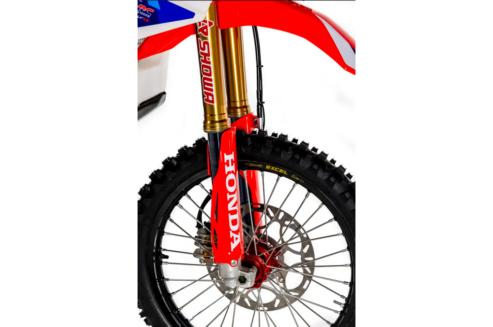 La fourche est dotée de réglages d'amortissement spécifiques et de ressorts à constantes élastiques différentes. La fourche est équipée de tubes en titane surdimensionnés avec traitement de surface Kashima, tandis que l'amortisseur est doté d'une tige de piston revêtue de titane pour réduire les frottements, tout comme la CRF450R Works Edition.