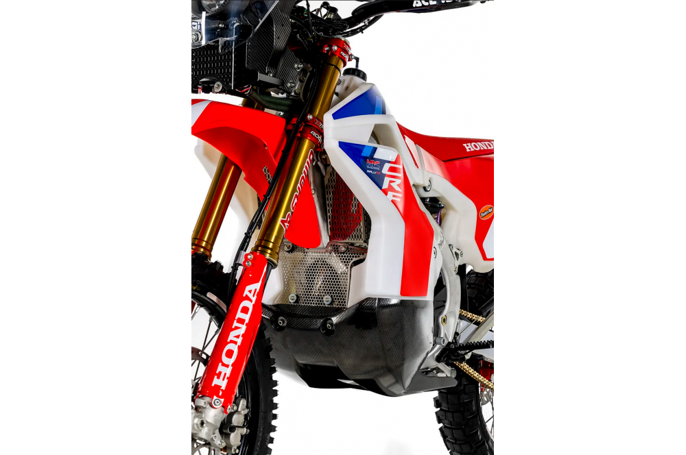 Tout comme le kit officiel CRF Rally, ce kit comprend un sabot de protection en fibre de carbone haute résistance conçue pour protéger la partie inférieure la plus exposée du grand réservoir de carburant avant de 22 litres contre les débris et les impacts. Il protège également les composants clés tels que le cadre, le carter moteur et le collecteur d'échappement. La partie avant présente un profil de « traîneau » qui aide à dissiper l'énergie d'impact des obstacles sans compromettre la maniabilité. De plus, un compartiment à outils intégré très pratique permet aux pilotes de transporter les outils essentiels pour les réparations d'urgence pendant les étapes de course.