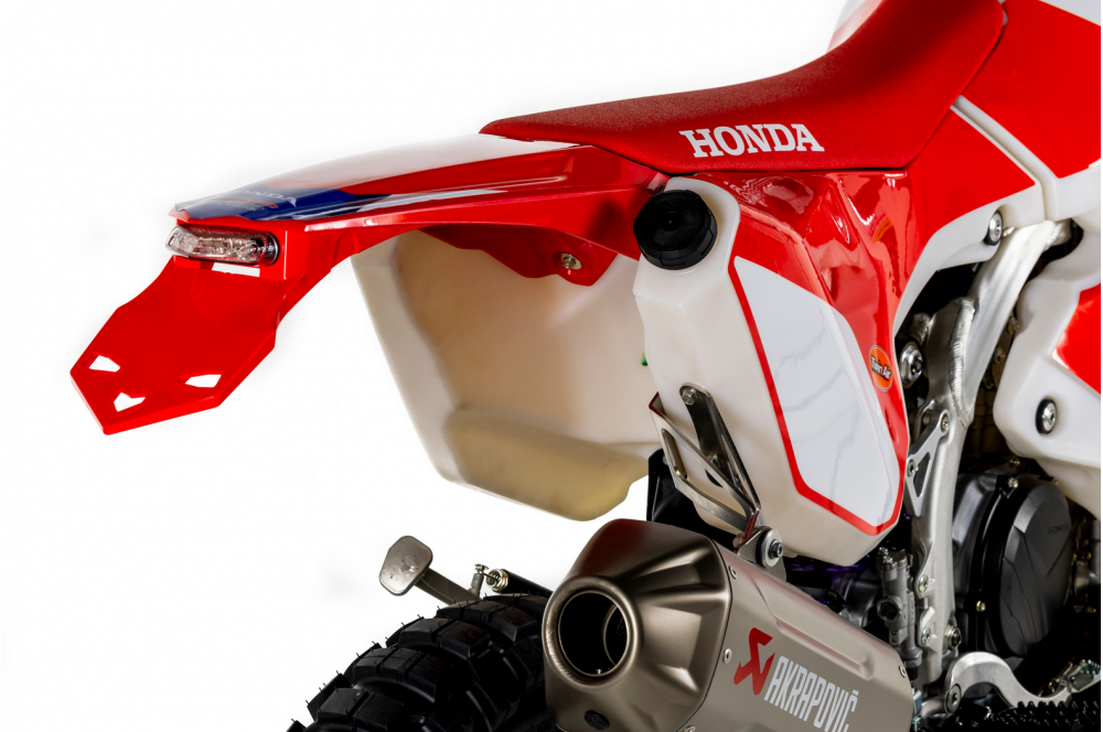 Pour être aussi proche que possible de la version officielle CRF RALLY et avoir une machine qui réponde aux spécifications de la course, le châssis de la CRF 450RX a été utilisé comme base technique. Cela garantit une stabilité dynamique maximale sur des terrains extrêmement accidentés et rocailleux. La moto est équipée d'un double réservoir de carburant (avant/arrière) d'une capacité totale de 36 litres. Le réservoir arrière de 14 litres est monté sur des silentblocs, réduisant l'inertie dans les virages et permettant au pilote de maintenir une conduite plus légère, plus agile et plus contrôlée.